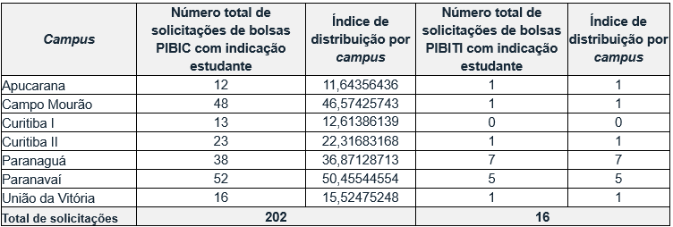 - Art. 18. § 2º. A distribuição de bolsas será proporcional entre os sete campi da Unespar e realizada de acordo com a quantidade de solicitações de bolsas, por campus, conforme a seguinte fórmula: