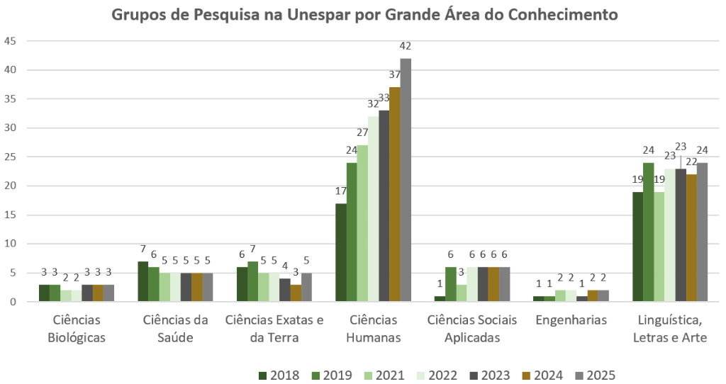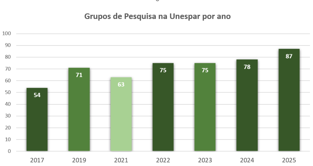 Fonte: Documentos oficiais da Diretoria de Pesquisa produzidos em resposta às Chamadas Públicas da Fundação Araucária do Paraná - período de 2017 a 2022. Diretório de Grupos de Pesquisa do CNPq - Unespar (novembro de 2025).