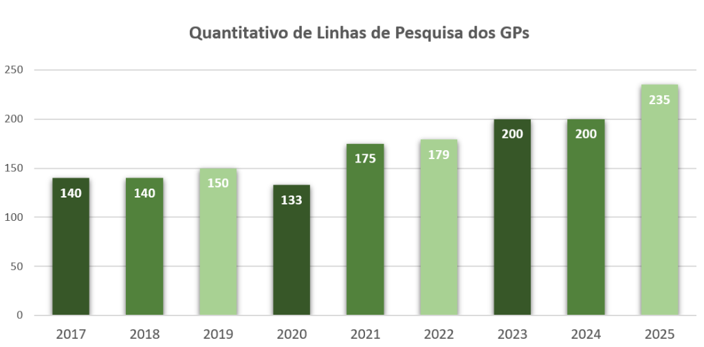 A partir de 2023, os registros do Diretório de Grupo de Pesquisa do CNPq e da Diretoria de Pesquisa foram incorporados como fonte. Essa abordagem visa uma perspectiva mais abrangente e completa das informações apresentadas.