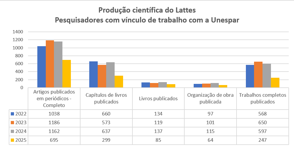 Os indicadores apresentados têm origem na Plataforma Carlos Chagas do CNPq e foram extraídos da produção científica registrada nos currículos Lattes de pesquisadores vinculados à Universidade Estadual do Paraná (Unespar). Estes estão categorizados por ano e refletem a data da extração, uma vez que a atualização dos currículos Lattes é um processo contínuo realizado pelos próprios pesquisadores.