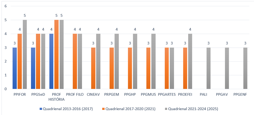 Cabe destacar que, inicialmente, as avaliações realizadas pela CAPES possuíam periodicidade trienal, passando a adotar o ciclo quadrienal a partir de 2017.